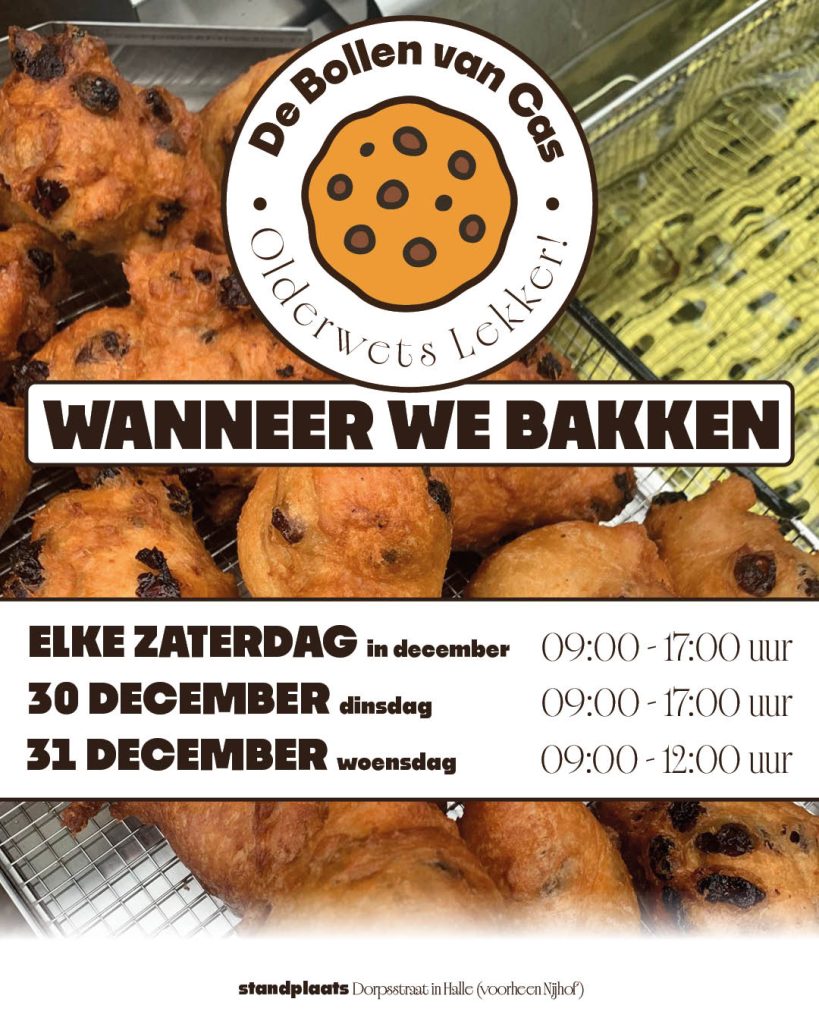 De oliebollenkraam in Halle is op elke zaterdag in december geopend. Ook voorziet De Bollen van Cas je van verse oliebollen op 30 december en 31 december.